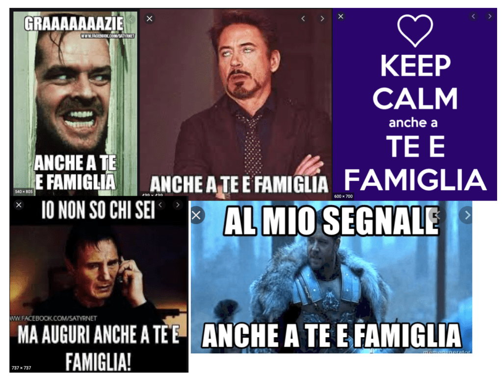Quando in Italia ci auguriamo “Buone feste”, di solito si risponde sempre “Anche a te e famiglia!“, che significa “Buone feste anche per te e per la tua famiglia”. Questo modo di dire è diventato sinonimo di un augurio poco sentito, fatto solo per buona educazione. Grazie ai social network, negli ultimi anni, “A te e famiglia!” si è trasformata in un meme divertente che diventa virale durante l’intero periodo natalizio.